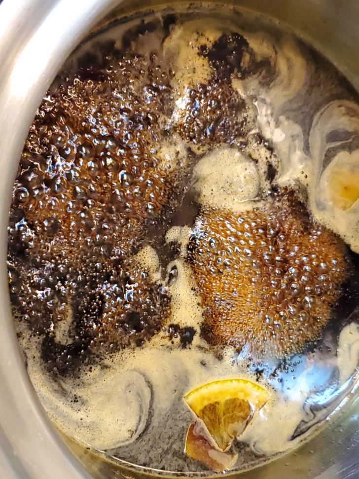 - 醤油・砂糖・スパイスを入れてひと煮たちさせる。